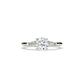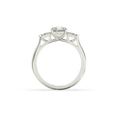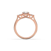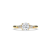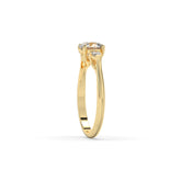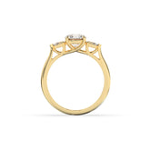 A striking take on the three-stone tradition – this engagement ring features a brilliant round center diamond, flanked by two perfectly cut trillion-shaped side stones. Set in radiant yellow gold, the design symbolizes the journey of past, present, and future love while adding a unique geometric flair. Perfect for those who want a touch of individuality with timeless meaning.