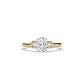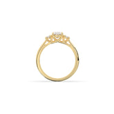 Timeless romance meets modern sophistication – this three-stone ring features a dazzling oval center diamond flanked by two brilliant side stones. The sleek yellow gold band enhances the elongated silhouette of the center stone, creating a design that is both classic and contemporary. A perfect symbol of your past, present, and future together.