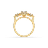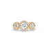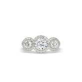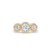 Celebrate your past, present, and future with this stunning three-stone engagement ring. The center lab-grown round diamond is flanked by two slightly smaller round diamonds, each surrounded by a glittering halo that enhances brilliance and creates a breathtaking sparkle from every angle. Crafted in warm yellow gold, this design is both meaningful and luxurious – a perfect choice for a love story that deserves to shine forever.