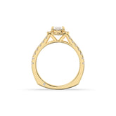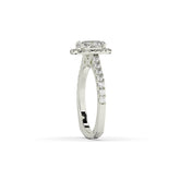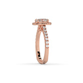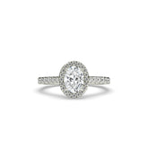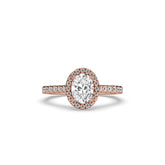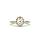 Timeless and radiant, this ring features an oval-cut center stone surrounded by a brilliant diamond halo. The pavé-set band enhances its sparkle, creating an elegant and luxurious look. Available in yellow, rose, or white gold.