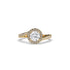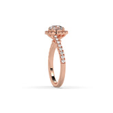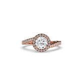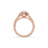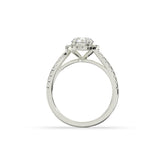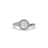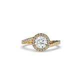 This stunning ring features a brilliant round-cut center stone surrounded by a halo of sparkling diamonds. The split-shank band is adorned with pavé-set diamonds, adding dimension and brilliance from every angle. Available in yellow, rose, or white gold.