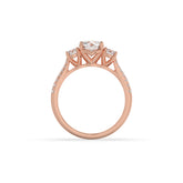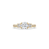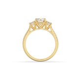 Celebrate your love story with this sophisticated three-stone engagement ring. The brilliant round center stone is perfectly complemented by two smaller round side stones, symbolizing your past, present, and future together. The delicate pavé-set diamonds on the yellow gold band add extra sparkle, making this design both timeless and modern.